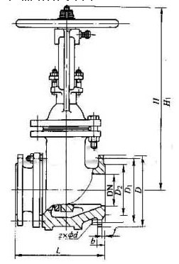 PZ41H-10 型手动耐磨排渣闸阀主要外形及结构尺寸(mm)| DN | L | D | D1 | D2 | b | z×Φd | f | H | H1 | 重量/kg |