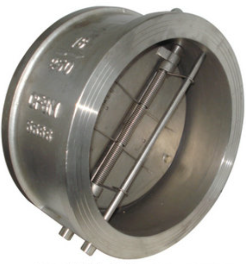 双瓣旋启对夹式止回阀由阀体、阀瓣、阀杆及弹簧等零件组成,采用对夹式连接,结构紧凑。由于阀瓣的关闭行程短,并有弹簧加载,关闭速度快,可显著减少水锤现象。产品具有体积小、重量轻、动作灵敏、密封可靠、安装方便等特点,可水平安装或垂直安装,可适用于水、蒸气、油品、硝酸、醋酸、强氧化性介质等多种介质。