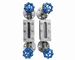 仪表的上下阀上装有法兰接头,与容器连接构联通器,透过玻璃板直接指示容器布什的液位,“夹套型”设有加热或冷却装置。该装置加热时可用蒸气,冷却时可用循环水,这样可以调节流动性能,夹套型接管尺寸ZG1/4内螺纹。在上下阀内装有钢球,当玻璃板因意外事故破坏时,钢球在容器压力作用下,自动密封,防止容器内的液体继续外流。在仪表的上端针形阀装有阻塞螺钉,可供放气之用,下端针形阀也装有阻塞螺钉。可供放空、取样、排污、清洗。