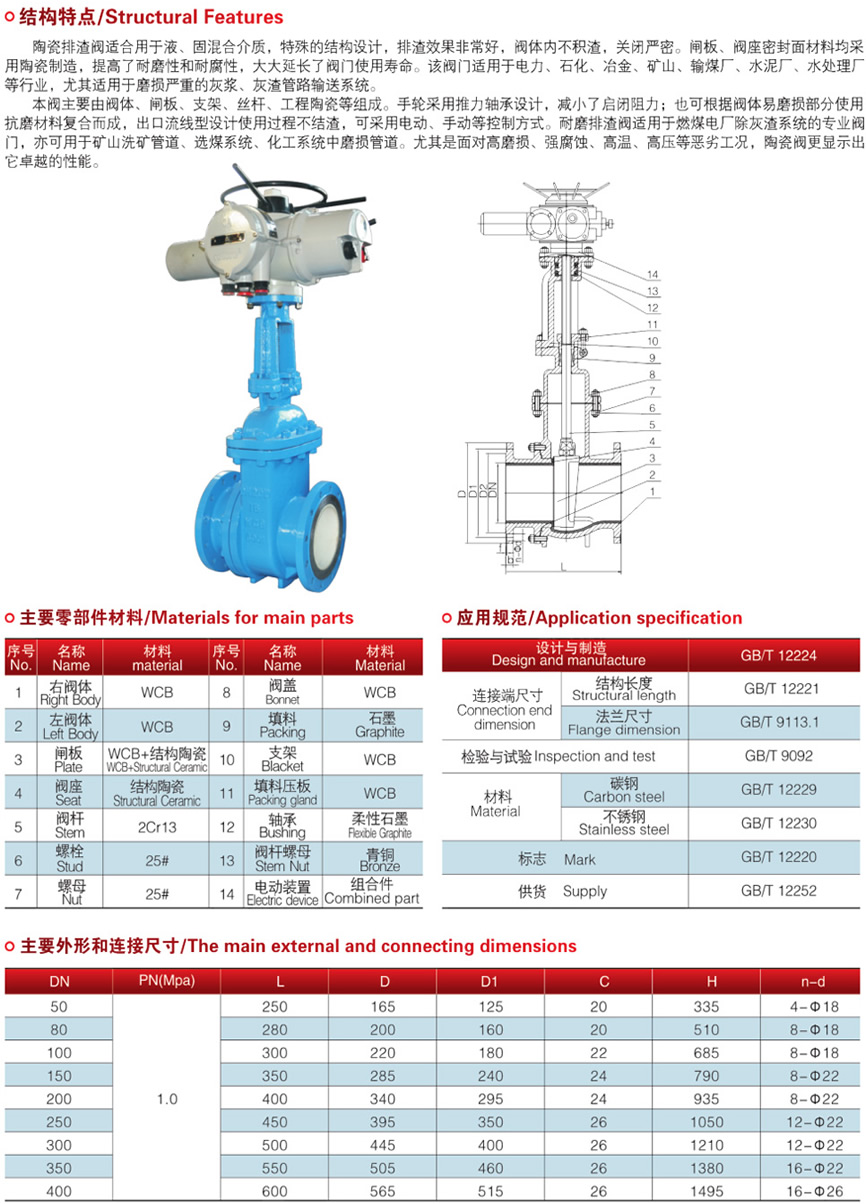 PZ941TC 电动耐磨陶瓷排渣阀适用于公称压力P N 1.6~6.4Mpa,工作温度0~100℃的火力电站水利排渣系统及水利工程的灰浆排放系统管路上,切断或接通管路中听介质,适用介质为:灰水混合物,渣水混合物。