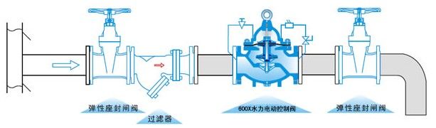 600X水力电动控制阀由主阀、电磁导阀、针阀、球阀、微形过滤器和压力表组成水力控制接管系统。通过电磁导阀可以实现对阀门开启和关闭的遥控。加装附加装置后,可控制开启和关闭的速度。本产品利用导阀控制阀门的开启和关闭,节省能源。可代替其它阀门大型电动装置。