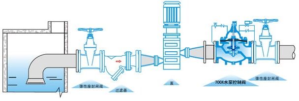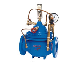 700X多功能水泵控制阀由主阀、电磁导阀、针阀、球阀、单向阀、行程开关、微形过滤器和压力表组成水力控制接管系统。水泵需停止工作时,先由进口压使主阀关闭90%后,水泵停止运转。剩余10%由回水关闭。可防止水锤现象发生。本产品利用电磁导阀控制,不需要其它装置和能源。节约能源,保养简便,停泵平稳。电磁阀可采用交流电220V或直流电24V。