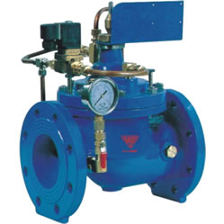 700X型PN10~PN25水泵控制阀由主阀、电磁导阀、针阀、球阀、单向阀、行程开关、微形过滤器和压力表组成水力控制接管系统。水泵需停止工作时,先由进口压使主阀关闭90%后,水泵停止运转。剩余10%由回水关闭。可防止水锤现象发生。本产品利用电磁导阀控制,不需要其它装置和能源。节约能源,保养简便,停泵平稳。本系列阀门产品用于高层建筑、生活区等供水管网系统及城市供水工程。